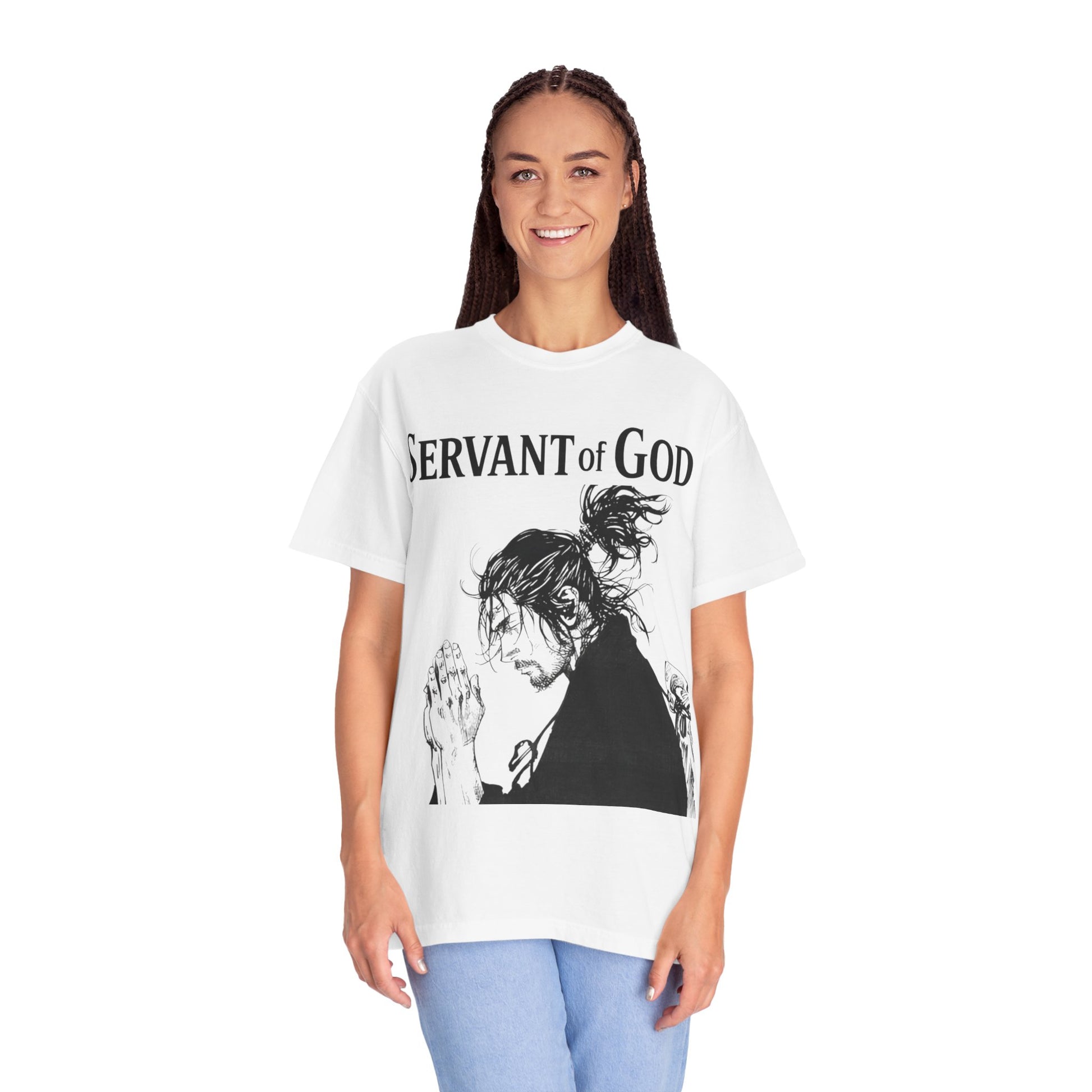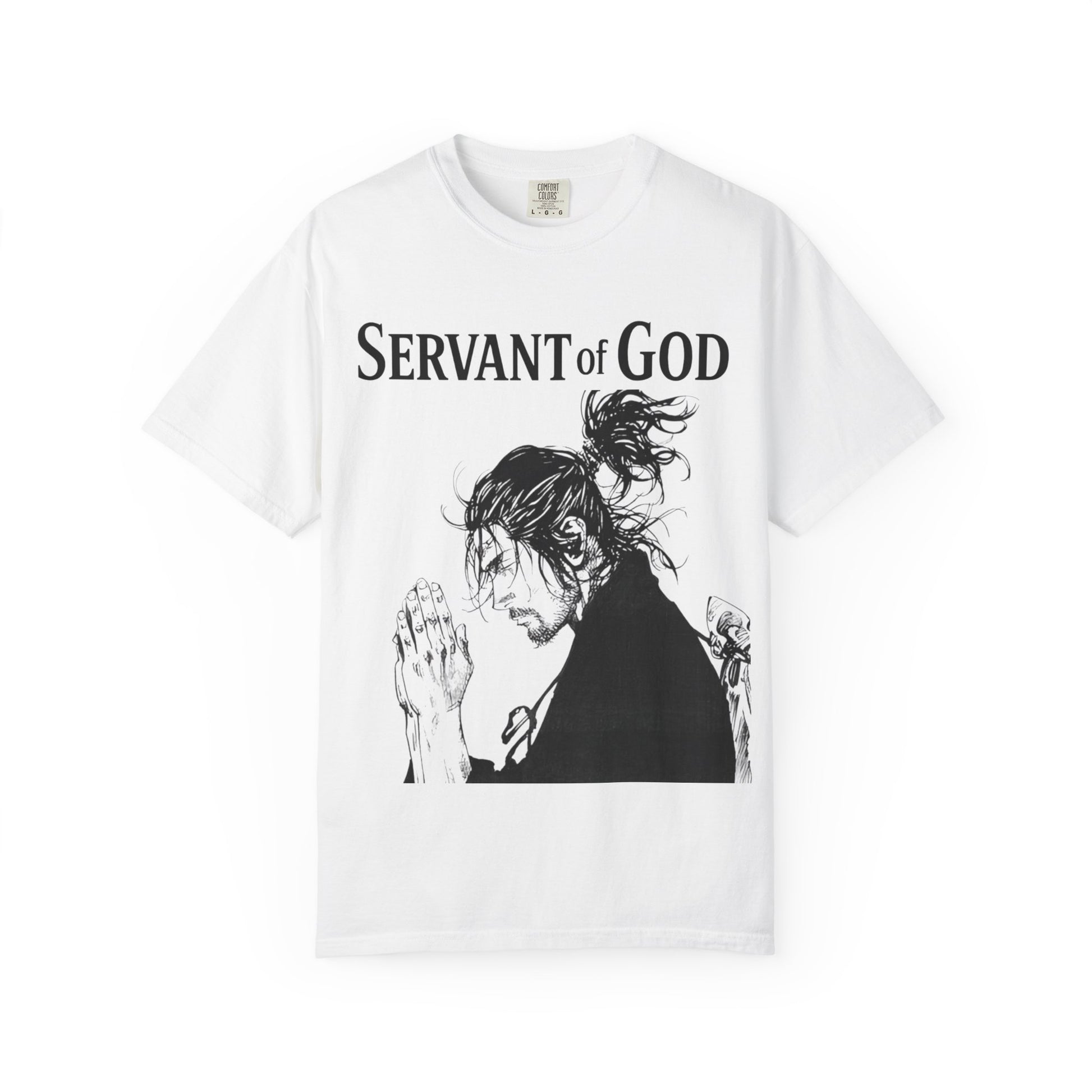 This garment brings together quiet strength and reverence. A soft, garment-dyed tee printed with an evocative image of Musashi as a prayerful warrior, layered with lines from the Lord’s Prayer. Wear it when you want to move from noise to focus — it settles the shoulders and slows the breath. Lightweight enough for a morning walk, substantial enough to feel like a shield during long days of thought. The muted, lived-in color and relaxed fit make it easy to pair with worn denim, a cardigan, or a contemplative corner at a cafe. It’s for people who move through life with intention, who carry both a warrior’s steadiness and a quiet devotion.
